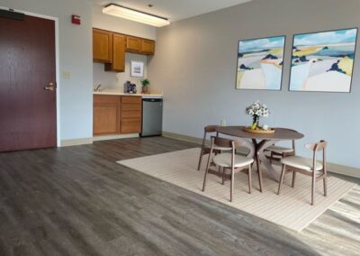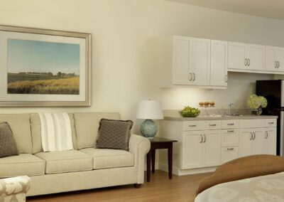 Our assisted living community a variety of living options, including studios, one-bedrooms with full kitchens, large studios, and “studio plus” apartments with two bathrooms in an apartment that is double the size of the standard studio. Meals, housekeeping, and linen service are included, as are assistance with the activities of daily living.